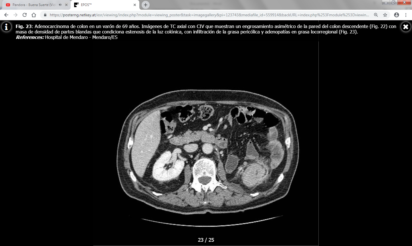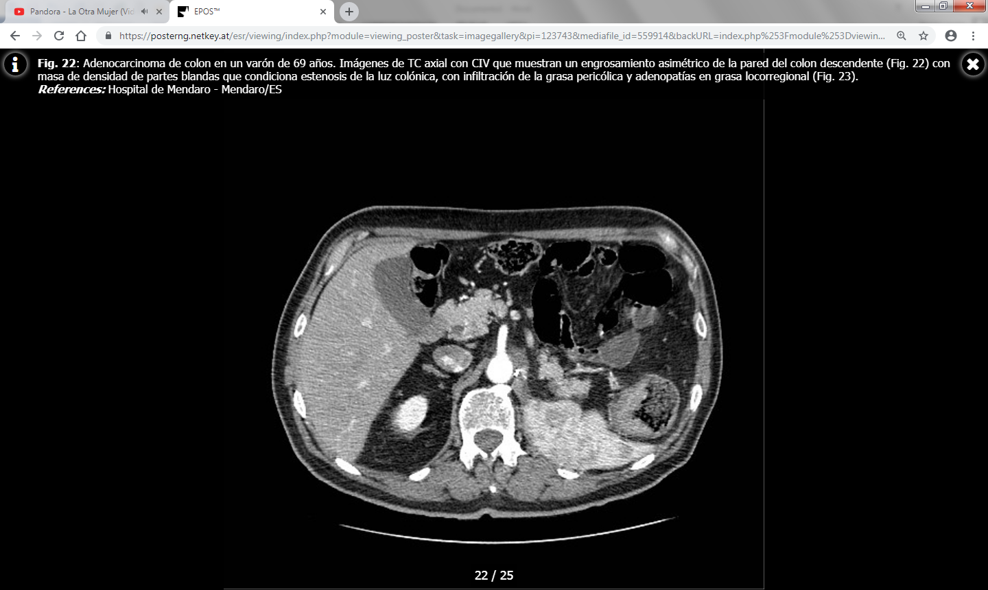 Los hallazgos en TC incluyen una masa de densidad de partes blandas de contornos irregulares o un engrosamiento parietal focal asimétrico que condicionan estenosis de la luz colónica. Las masas de mayor tamaño pueden presentar un centro necrótico de baja atenuación y ocasionalmente pueden contener gas.
